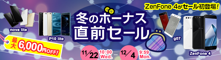 P10 lite、nova liteなどの人気のSIMフリー端末が、最大6,000円OFFとなっています。