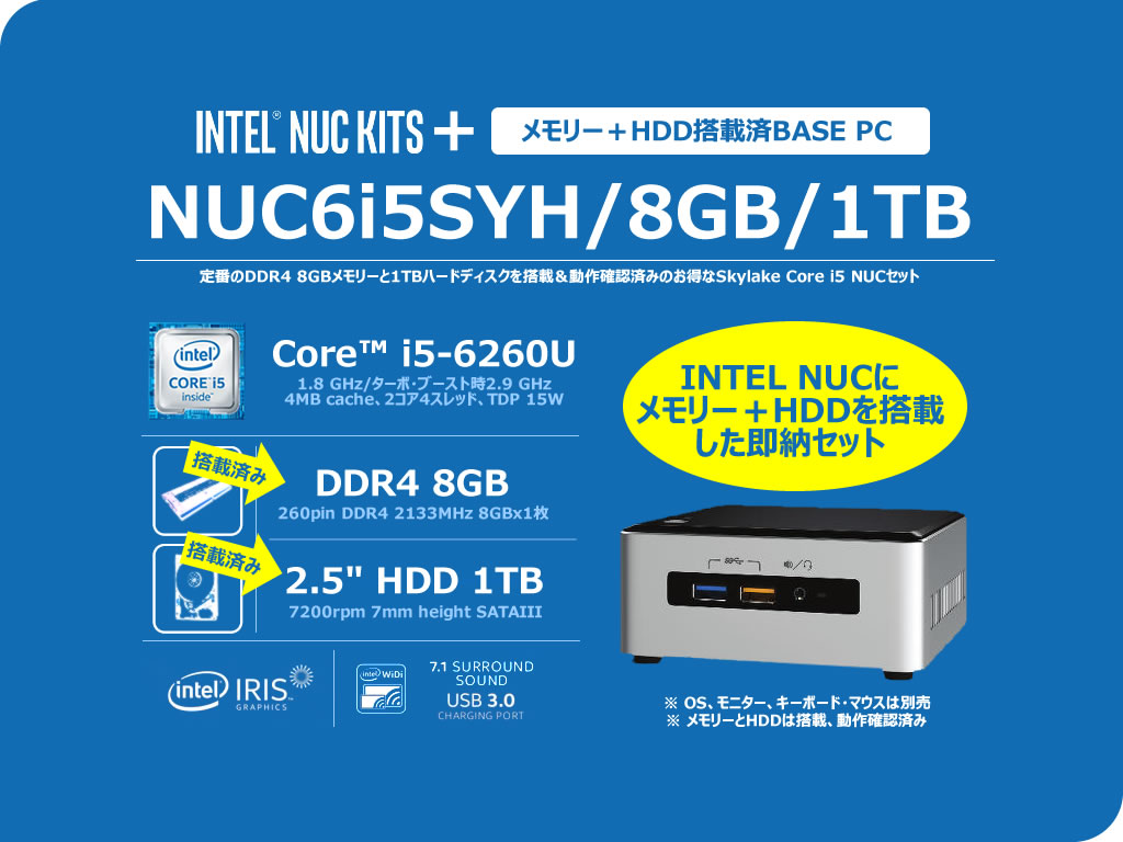 Core i5-6260Uと8GBメモリに、1TB HDDを搭載したOSレスモデルです。