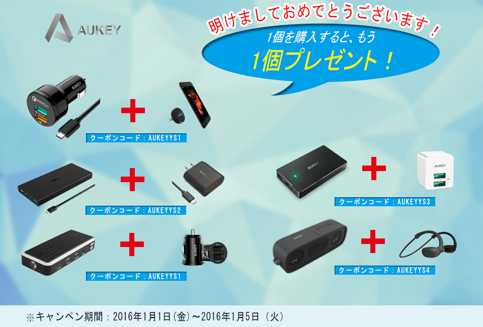 Aukeyで 「1つ購入でもう1つが無料 新年セール2016」 が開催中です。