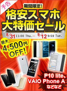 P10 liteやVAIO Phone Aなどのスマホが、最大4,500円OFFとなるセールです。