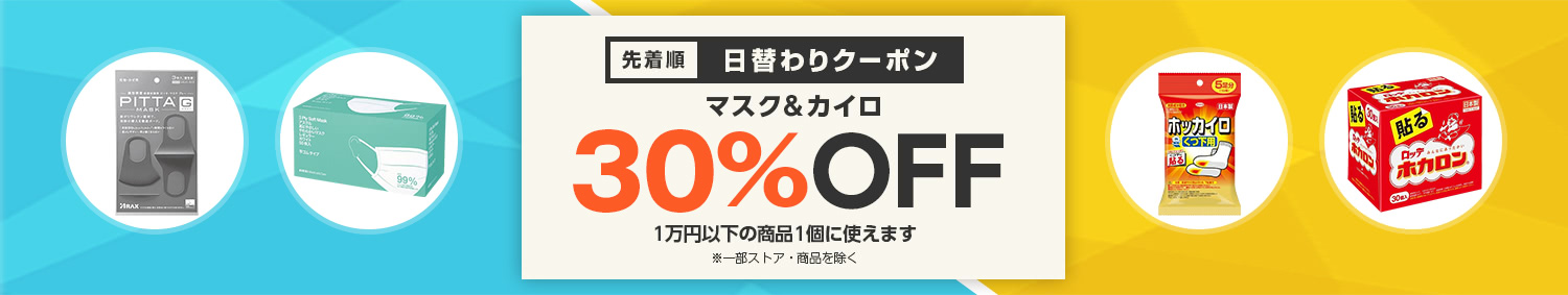 Yahoo!ショッピングで 【マスク&カイロカテゴリで使える30%OFFクーポン】 が開催中です。