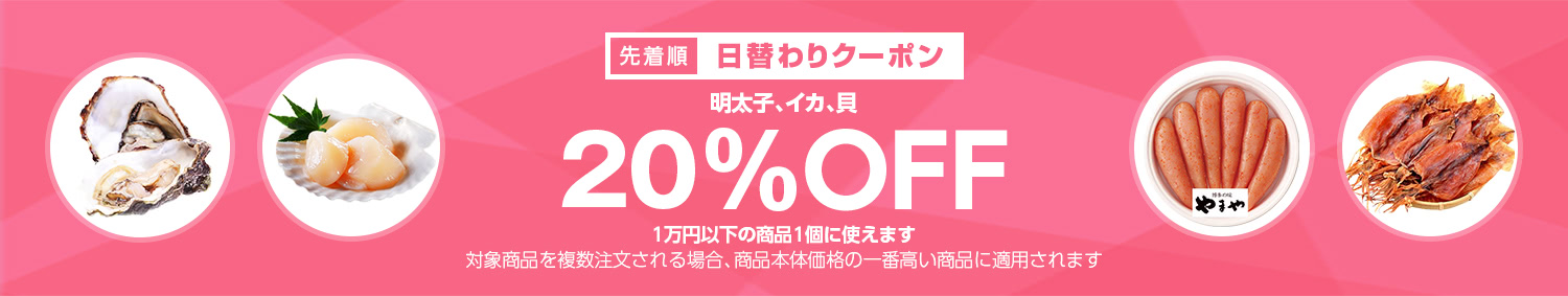 Yahoo!ショッピングで 【明太子、イカ、貝カテゴリで使える20%OFFクーポン】 が開催中です。