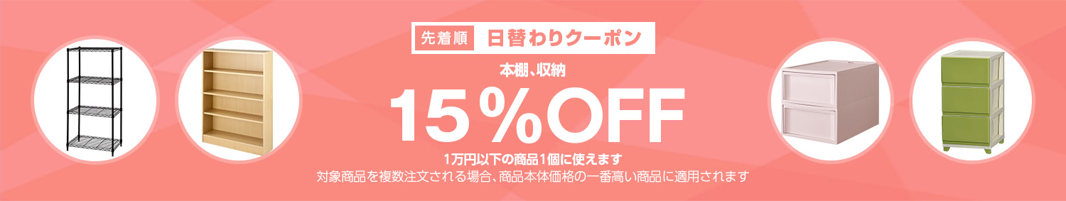 Yahoo!ショッピングで 【本棚、収納カテゴリで使える15%OFFクーポン】 が開催中です。