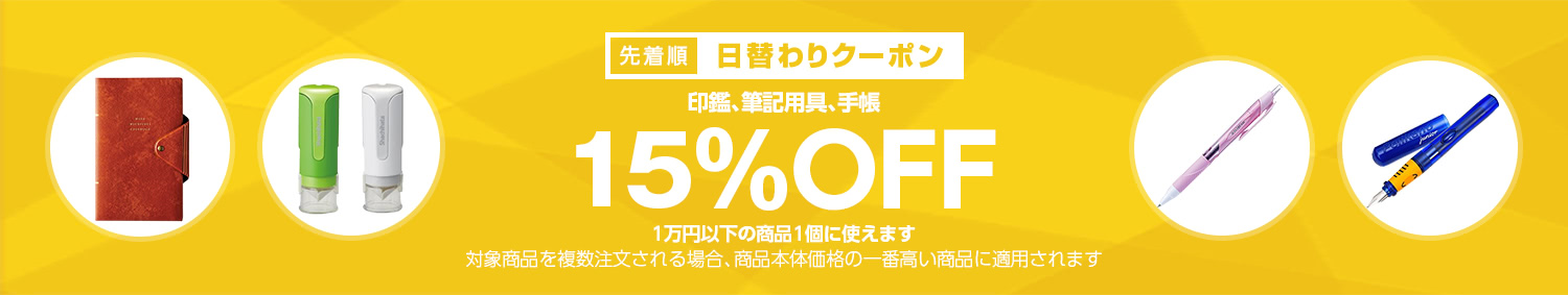 Yahoo!ショッピングで 【印鑑、筆記用具、手帳カテゴリで使える15%OFFクーポン】 が開催中です。