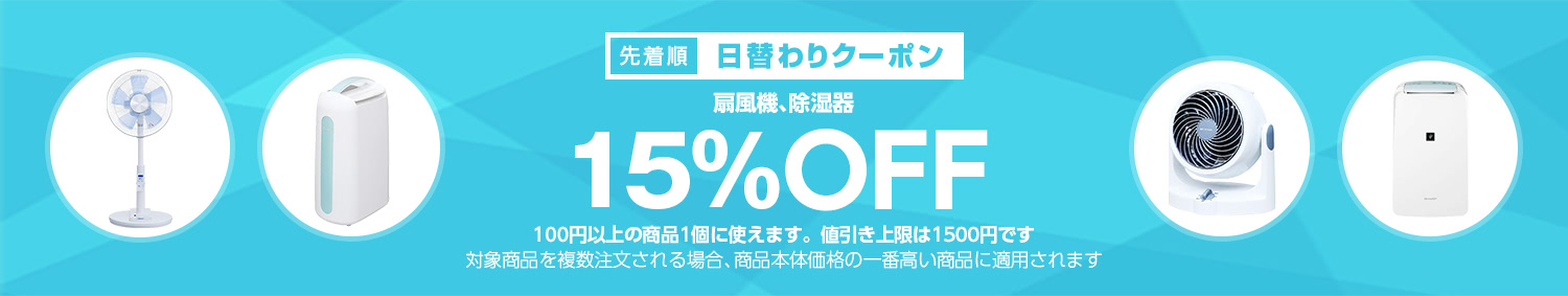 Yahoo!ショッピングで 【扇風機、除湿器カテゴリで使える15%OFFクーポン】 が開催中です。