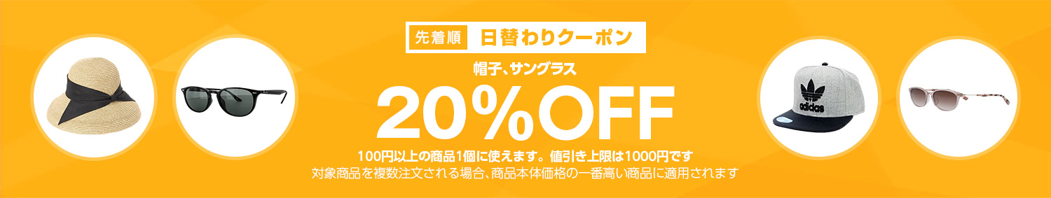 Yahoo!ショッピングで 【帽子、サングラスカテゴリで使える20%OFFクーポン】 が開催中です。