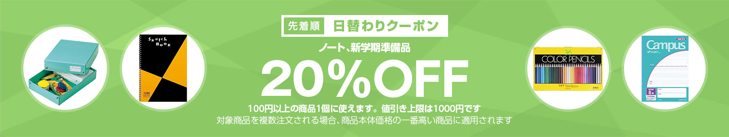 Yahoo!ショッピングで 【ノート、新学期準備品カテゴリで使える20%OFFクーポン】 開催中です。