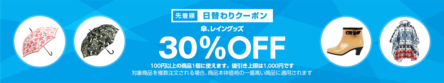 Yahoo!ショッピングで 【傘、レイングッズカテゴリで使える30%OFFクーポン】 が開催中です。
