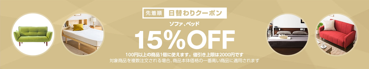 Yahoo!ショッピングで 【ソファ、ベッドカテゴリで使える15%OFFクーポン】 が開催中です。