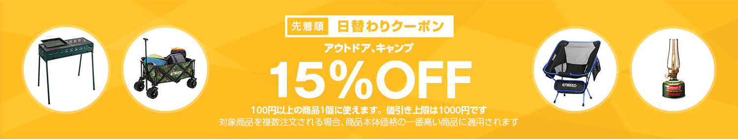 Yahoo!ショッピングで 【アウトドア、キャンプカテゴリで使える15%OFFクーポン】 が開催中です。