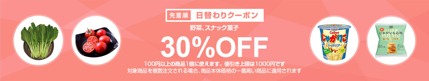Yahoo!ショッピングで 【野菜、スナック菓子カテゴリで使える30%OFFクーポン】 が開催中です。