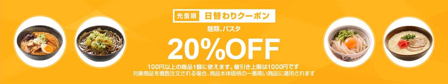 Yahoo!ショッピングで 【麺類、パスタカテゴリで使える20%OFFクーポン】 が開催中です。