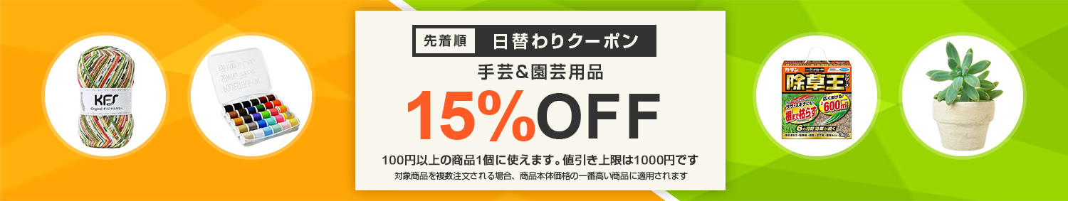 Yahoo!ショッピングで 【手芸&園芸用品カテゴリで使える15%OFFクーポン】 が開催中です。