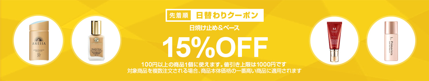 Yahoo!ショッピングで 【日焼け止め&ベースカテゴリで使える15%OFFクーポン】 が開催中です。