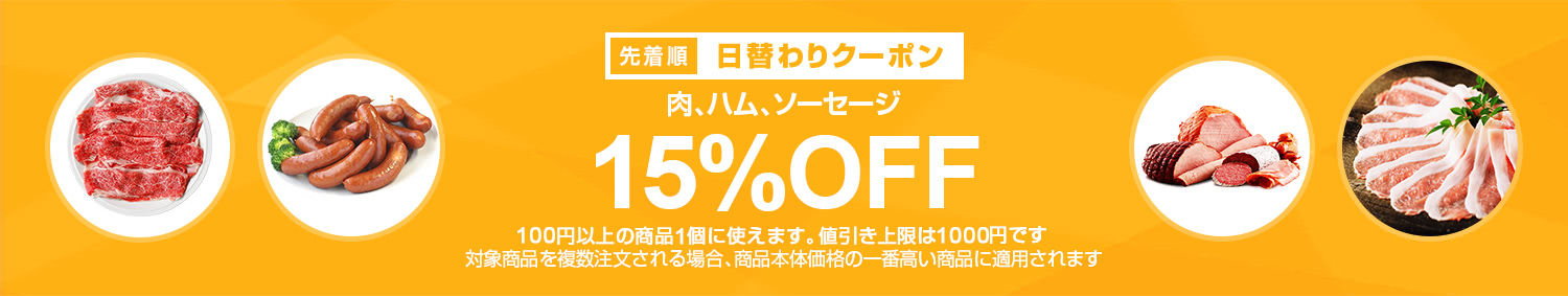 Yahoo!ショッピングで 【肉、ハム、ソーセージカテゴリで使える15%OFFクーポン】 が開催中です。
