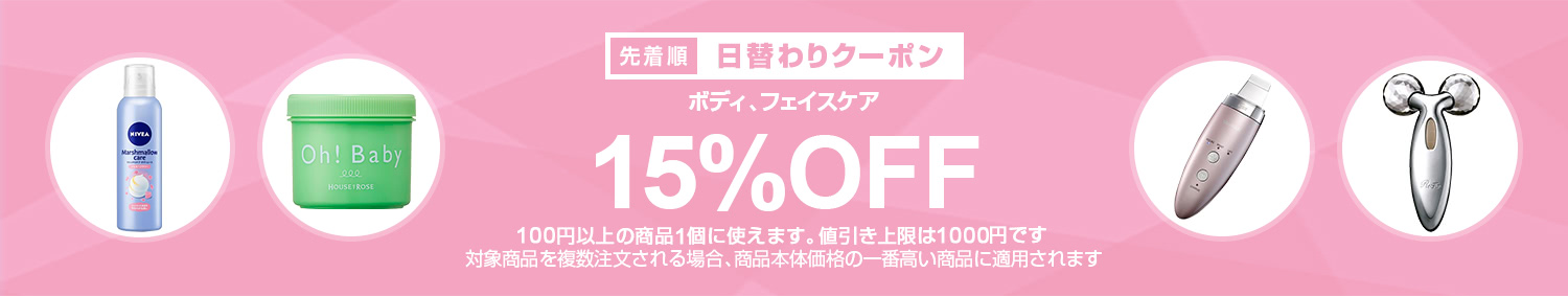 Yahoo!ショッピングで 【ボディ、フェイスケアカテゴリで使える15%OFFクーポン】 が開催中です。