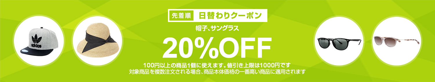 Yahoo!ショッピングで 【帽子、サングラスカテゴリで使える20%OFFクーポン】 が開催中です。