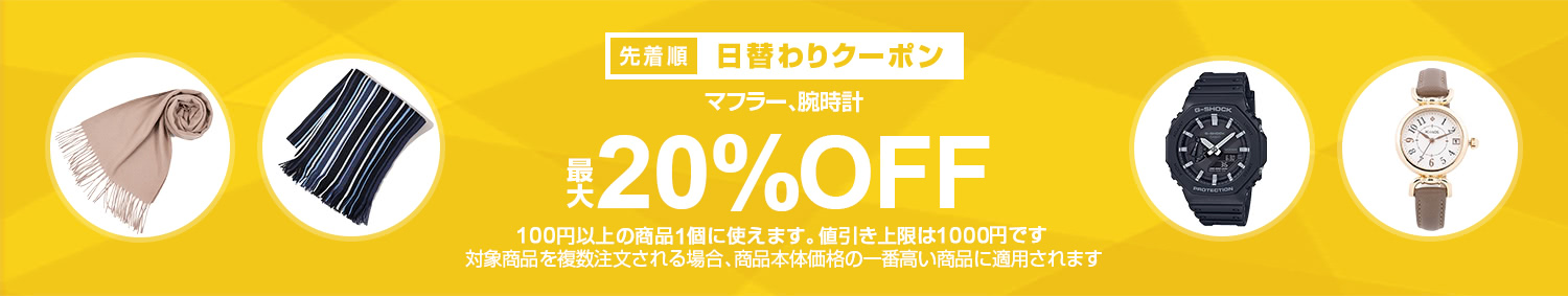 Yahoo!ショッピングで 【マフラー、腕時計カテゴリで使える最大20%OFFクーポン】 が開催中です。