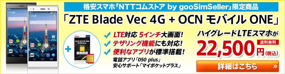 NTTコムストアで 「SIMフリー ZTE Blade Vec 4G+SIMセット」 が特価販売中です。